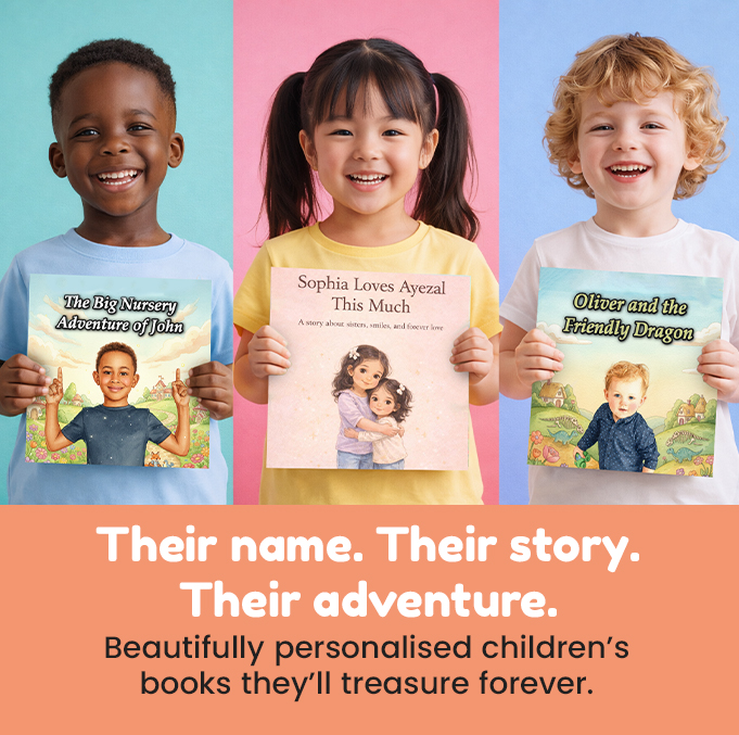 Each book can be tailored with custom names, personalised characters, and even illustrations based on your photos. Available for age groups 2-4, 4-6, 6-8, and 8+